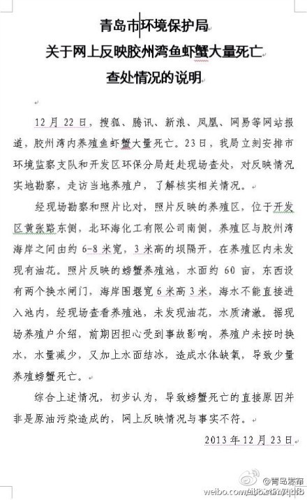????12月22日,搜狐、騰訊、新浪、鳳凰、網(wǎng)易等網(wǎng)站報(bào)道,膠州灣內(nèi)養(yǎng)殖魚蝦蟹大量死亡。23日,青島市環(huán)保局發(fā)布關(guān)于網(wǎng)上反映膠州灣魚蝦蟹大量死亡查處情況的說明。當(dāng)晚@青島發(fā)布 官方微博轉(zhuǎn)發(fā)了@青島環(huán)保 的相關(guān)微博,對(duì)此事做出澄清說明。