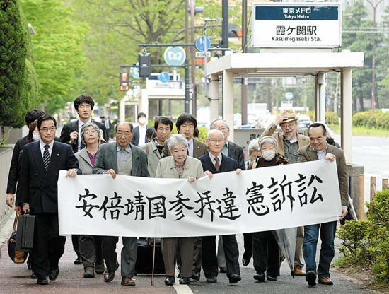 4月21日,日本東京市民代表手持標(biāo)語(yǔ)走向東京地方法院。當(dāng)日,東京270多名市民代表向東京地方法院提起訴訟,要求判決日本首相安倍晉三參拜靖國(guó)神社違憲,并停止參拜。新華社照片