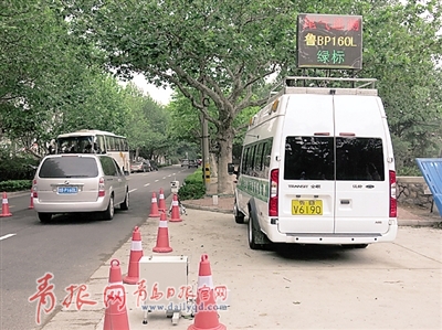 記者在位于延安一路的執(zhí)勤點(diǎn)看到,機(jī)動(dòng)車(chē)尾氣遙感監(jiān)測(cè)車(chē)停放在道路一側(cè),兩臺(tái)小型手提箱大小的機(jī)動(dòng)車(chē)排氣檢測(cè)儀分列道路兩側(cè),一臺(tái)小型攝像機(jī)被安置在路邊,過(guò)往車(chē)輛一駛過(guò)檢測(cè)儀和攝像機(jī),位于監(jiān)測(cè)車(chē)頂端的LED顯示屏便立即顯示出通過(guò)車(chē)輛的車(chē)牌號(hào)、有無(wú)環(huán)保標(biāo)志等信息。