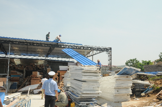 該處違章板房違章板房位于枯桃社區(qū)李宅路南側(cè)、高爾夫球場東側(cè),面積約300余平方米,六月初執(zhí)法人員巡查時發(fā)現(xiàn)。由于采用大量的苯板材料,而且是用于存放和加工木頭材料,因此存在重大的安全隱患,一旦發(fā)生火災(zāi)后果將不堪設(shè)想。執(zhí)法人員責(zé)令當(dāng)事人自行拆除,直到昨天為止當(dāng)人事一點也沒有自行拆除的跡象,于是執(zhí)法人員于昨天通知于今日進行強制拆除。今早九點半執(zhí)法人員到達現(xiàn)場,當(dāng)事人安排了三四個工人在拆,但進展相當(dāng)緩慢,于是安排了工作人員對其進行人工拆除,預(yù)計明天將全部拆除完畢。