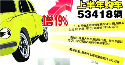 1—6月份全市銷售車輛53418輛,銷售收入約76億元,同比分別增長(zhǎng)19%和30%