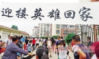 昨天中午,載著李富龍骨灰和親人的專車緩緩駛進(jìn)膠州市李小莊鐵路小區(qū)。聞訊趕來的3000多位膠州市民自發(fā)來到小區(qū)門口送英雄一程。李小莊鐵路小區(qū)的門口拉起了“迎接英雄回家”的白色橫幅。素不相識的市民拉起寫有“富龍,你是英雄!”的橫幅。他們有的胸帶黑色絹花,有的手捧白菊花,人人面色肅穆。聞訊而來的“蒲公英公益平臺”義工組織16位志愿者手拉“迎接英雄李富龍回家”的標(biāo)語,不顧天氣悶熱,翹首等待英雄歸來。