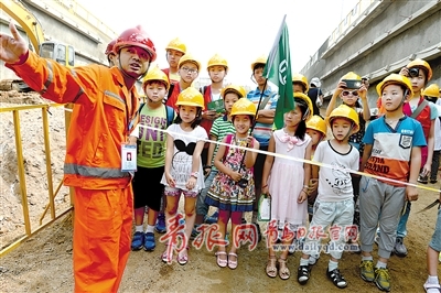 活動(dòng)主辦方將暑期親子活動(dòng)的首站定在了參觀青島地鐵2號(hào)線海安路施工現(xiàn)場(chǎng)。大多數(shù)孩子是第一次近距離地接觸地鐵施工現(xiàn)場(chǎng),孩子們感慨道:“原來,爸爸是在這樣的環(huán)境下工作的??!”