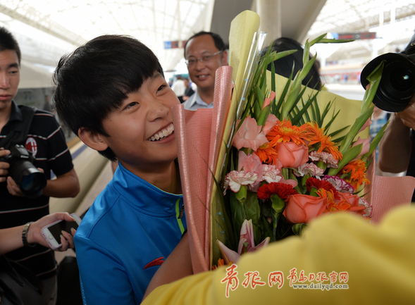 ????青島日?qǐng)?bào)/青報(bào)網(wǎng)訊 8月29日下午,在南京青奧會(huì)為中國(guó)代表團(tuán)獲得首枚田徑金牌的青島小姑娘馬振霞從北京-青島動(dòng)車(chē)回到家鄉(xiāng)青島,受到青島市體育局的領(lǐng)導(dǎo)和市體校的教練、隊(duì)友的熱情歡迎。周光輝攝
