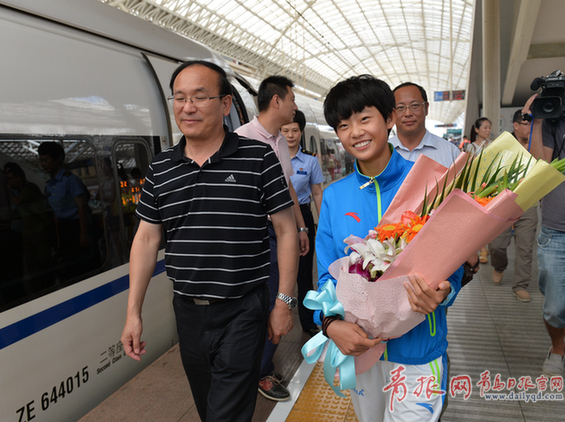 青奧會(huì)奪金小曼兒馬振霞回到青島