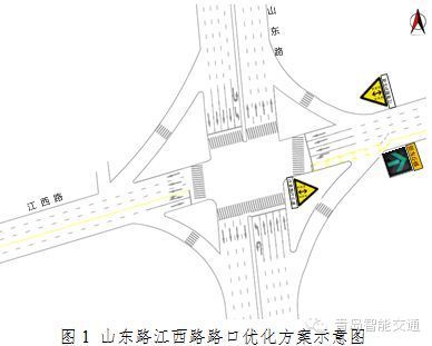 ?山東路江西路路口交通組織優(yōu)化措施為,利用東出口車道資源,設置潮汐車道,完善配套交通設施,優(yōu)化信號控制方案。其中,潮汐車道燈啟亮,且條形屏提示“左轉(zhuǎn)車進潮汐車道”時,左轉(zhuǎn)車輛可提前駛?cè)氤毕嚨?,等待東向西方向的左轉(zhuǎn)信號燈變綠燈時通過路口;當潮汐車道燈關閉時,東向西所有車輛禁止駛?cè)氤毕嚨馈?/p>