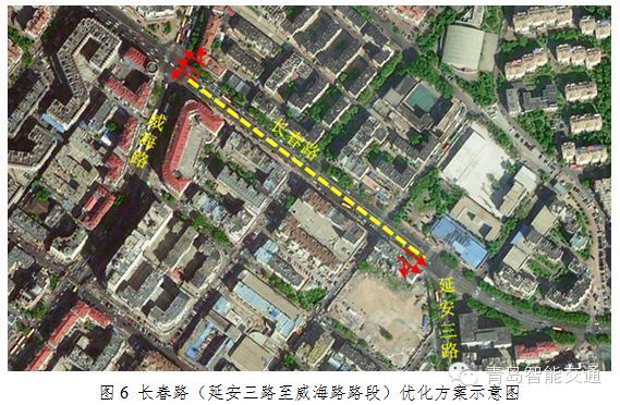 ?長春路(延安三路至威海路路段)交通組織優(yōu)化措施為,擬將長春路(延安三路至威海路路段)中央隔離護欄向南側(cè)偏移一個車道。威海路與長春路路口東進口車道渠化為左轉(zhuǎn)、直行、直右,延安三路與長春路路口西進口車道渠化為直行、直右。