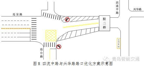 ?四流中路與興華路路口交通組織優(yōu)化措施為,四流中路與興華路路口南出口公交車站(207、23路)向南遷移100米;滄臺路與滄安路路口東進口膠二橋洞駛出車輛禁止左轉(zhuǎn)駛?cè)霚媾_路;滄臺路與滄安路路口南進口滄臺路車輛禁止左轉(zhuǎn)駛?cè)霚姘猜?;滄臺路與滄安路路口西進口增設中央隔離護欄;滄臺路與滄安路路口內(nèi)部施劃網(wǎng)狀線,對違法駛?cè)胲囕v進行抓拍與處罰;對滄安路與滄臺路路口北側(cè)人行橫道進行拓寬與劃線;膠二橋洞內(nèi)施劃雙黃線,兩側(cè)車輛禁止變道。
