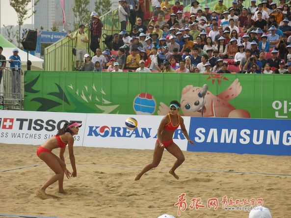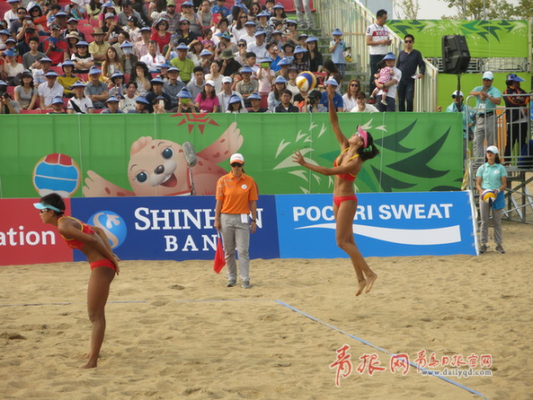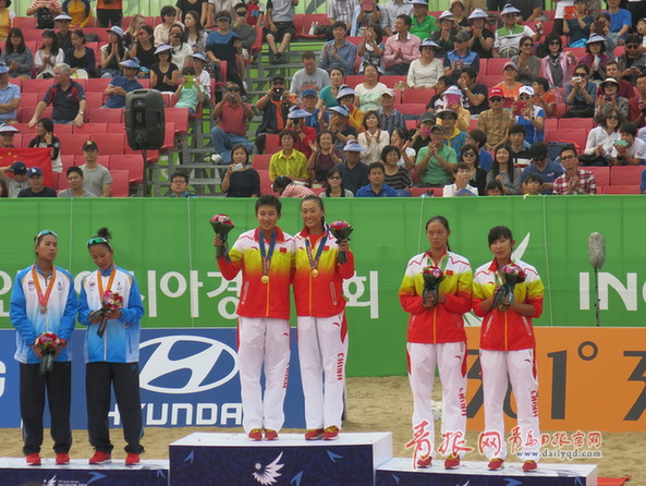 ????青島日報/青報網(wǎng)訊?北京時間9月28日,2014年仁川亞運會沙灘排球比賽在松島國際大學沙灘排球運動場繼續(xù)進行。女子決賽,中國組合馬園園/夏欣怡發(fā)揮出色,在揮霍兩個賽點后以2-0(21-12、21-18)擊敗了泰國組合拉達隆/塔娜拉提哈奪得金牌,幫助中國隊實現(xiàn)四連冠,值得一提的是,這也是中國代表團本屆比賽的第100枚金牌。在此之前,王凡/岳園以2-0戰(zhàn)勝一對泰國組合,收獲銅牌。