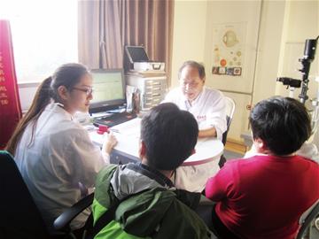 ????下午4時30分左右,裴先生一家人坐到了王傳富的面前。王傳富一邊詢問嬰兒病情,一邊輕輕地按壓孩子左眼,同時在病歷上做記錄。 “我給你們畫個圖看,你們就明白了。 ”為了方便家長了解病情,王傳福在病歷表上畫起了“簡筆畫”,語速緩慢地向家長講解孩子眼睛是圖中的哪個位置出了問題,治療的方案又有幾種。