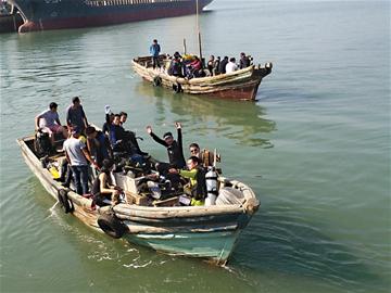 ????半個(gè)小時(shí)后,在距離記者所在船只大約十米的海面上,隨著持續(xù)的氣泡不斷冒出,一名潛水員冒出水面。在大家的幫助下,這名潛水員回到了船上,手里的網(wǎng)兜里有一堆大海螺,數(shù)了數(shù)足有20多個(gè)。 “真過(guò)癮,我在水下面就笑了,差點(diǎn)嗆著。 ”這名潛水員大笑著說(shuō)。