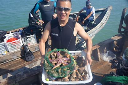 ????“這個(gè)季節(jié)海里的東西還是很豐富的,最多的就是海參、大海螺、海星,再就是各種貝類(lèi)、海膽,八代蛸也不少?!睆堖B玉介紹,潛水的魅力在于每一次潛入水下都能感受到視覺(jué)上的享受,因?yàn)榧幢阋恢黄胀ǖ暮B菰诤5壮尸F(xiàn)出來(lái)的樣子都是讓人難忘的,更何況像海底狩獵比賽這樣的趣味運(yùn)動(dòng),在大家享受大海的同時(shí),更能體會(huì)收獲的樂(lè)趣和滿足感。
