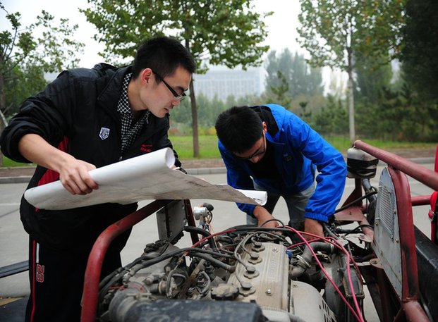 ????說起劉晉設計的這輛“鋼管”跑車,也是花費不少精力,在李松、徐立偉、韓玉強、馬星明、劉方帥等同學的協助下完成。劉晉告訴記者,“我這輛車看起來很簡單,車架主要由鋼管焊接而成,連發(fā)動機都是摩托車的發(fā)動機?!睘榱嗽O計這輛跑車,劉晉他們也沒少投資,劉晉笑著說,“學校也給我們提供了六千元的資金支持,給我們解決了很大的困難?!眻D為劉晉對他的“鋼管”跑車進行檢修。