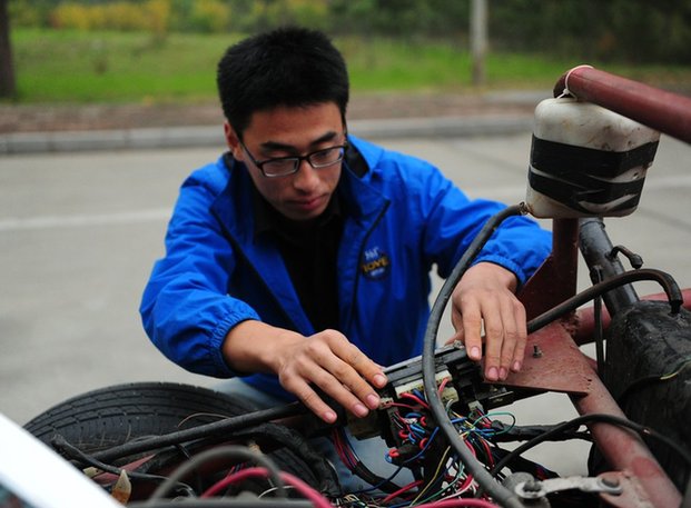????“原子”跑車耗時一年,花費了2萬多塊錢。“主要是熱愛,大家又互相幫助,買零部件的錢都是拼湊的!”于勝康笑著說。據了解,學校在得知于勝康他們研制“跑車”的事情后,給予很大的支持。于勝康他們設計的這兩跑車,就有學院給予的七千元資助。圖為于勝康對跑車進行檢修。
