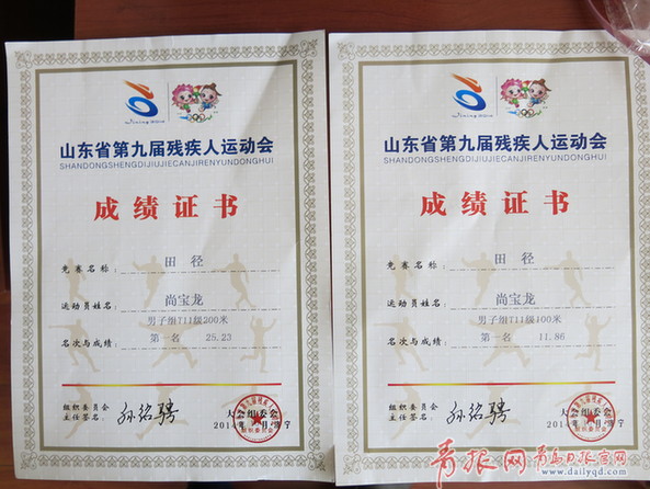 2006年時(shí),雖然取得了一些成績(jī),但尚寶龍還是做了一個(gè)大膽的決定:他要轉(zhuǎn)項(xiàng)目。因?yàn)榈诙昃陀猩綎|省殘疾人田徑比賽,于是他就練起了短跑。盲人走路尚且不便,還要跑步,還想奪冠?但讓他自己也沒有想到的是,僅僅訓(xùn)練了一年的時(shí)間,他就在省運(yùn)會(huì)中取得了五項(xiàng)第一?!褒埜绠?dāng)時(shí)拿了100米、200米、400米,以及100米接力、400米接力五枚金牌?!币慌缘拿戏残χ呹种割^邊給記者算。