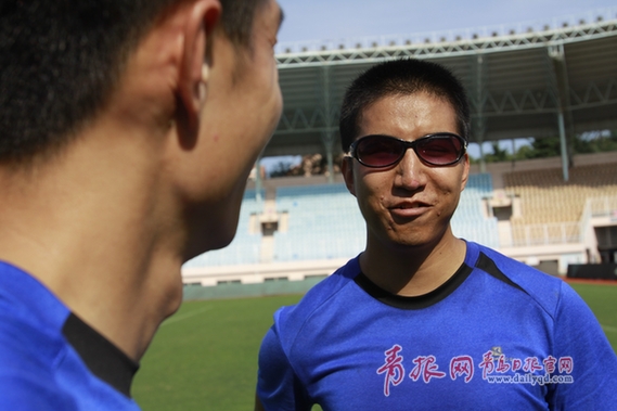 如果說孟凡是糊里糊涂成了引跑員,那么尚寶龍則是誤打誤撞成了盲人運(yùn)動(dòng)員。今年27歲的尚寶龍戴著墨鏡,因?yàn)橄忍煨郧喙庋?,他?4歲的時(shí)候完全失明了,為習(xí)得一技之長(zhǎng),尚寶龍只身來到青島盲校。在一次經(jīng)過足球場(chǎng)時(shí),皮球滾到他的身邊,他就不經(jīng)意間做了個(gè)停球動(dòng)作,動(dòng)作自然準(zhǔn)確得好像能夠看見皮球似的,場(chǎng)邊的教練興奮地一指:“就是他了!”原來是青島正在組建第一支盲人足球隊(duì),尚寶龍就這樣在2004年時(shí)成為了我國(guó)第一批盲人足球運(yùn)動(dòng)員,走上了練習(xí)體育的道路。