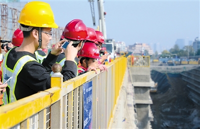 地鐵2號(hào)線(xiàn)海安路站位于海安路與香港東路交界處南側(cè),車(chē)站沿香港東路路中設(shè)置,為地下兩層局部三層的島式車(chē)站,采用明挖法施工。目前,車(chē)站已進(jìn)入主體結(jié)構(gòu)施工階段。開(kāi)放日活動(dòng)中,前來(lái)參觀的市民對(duì)地鐵施工的環(huán)保、技術(shù)、工期等問(wèn)題非常感興趣,不時(shí)詢(xún)問(wèn)現(xiàn)場(chǎng)施工人員,還有的市民帶著攝像機(jī),對(duì)整個(gè)活動(dòng)進(jìn)行了全程錄像。