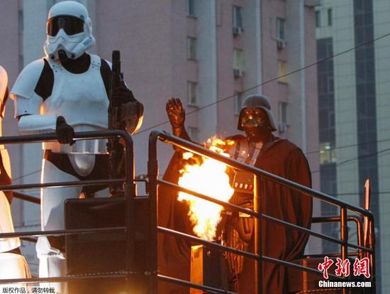 當(dāng)?shù)貢r(shí)間10月22日,烏克蘭基輔街頭,烏克蘭網(wǎng)絡(luò)黨候選人扮成《星球大戰(zhàn)》中的黑武士游街,黑暗系造型為自己造勢(shì)拉選票。黑武士將參加于本月26日舉行的議會(huì)選舉,以推行電子政府并增加財(cái)政的透明度。
