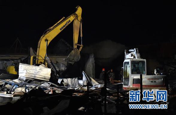 11月17日凌晨,消防人員在現(xiàn)場救援。 11月16日晚7時(shí),壽光市龍?jiān)词称酚邢薰疽缓}卜包裝車間發(fā)生火災(zāi),事故已致18人死亡。 新華社記者 朱崢攝