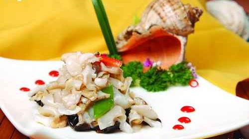 ??? 山東青島的油爆海螺? 海螺是青島的深水特產(chǎn),海螺肉質(zhì)鮮嫩,細(xì)膩可口。以本地紅島淺海的黑皮大海螺為主料,做成的油爆海螺是非常具有青島特色的美味,被評為山東省首屆魯菜大獎賽優(yōu)秀菜和青島十大代表菜之一。該菜品的特點是:鮮而不膩,嫩猾酥軟。