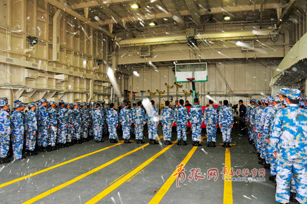 ????青島日?qǐng)?bào)/青報(bào)網(wǎng)訊 2014年的最后一天,青島寒風(fēng)凜冽,迎來(lái)了第一場(chǎng)雪。某軍港碼頭,鷗鳥翱翔,軍旗勁展,曼舞的雪花飄落在官兵的海洋迷彩服上。北海艦隊(duì)某防救支隊(duì)在長(zhǎng)興島船艦載直升機(jī)平臺(tái)上,隆重舉行了一場(chǎng)遲到的“向軍旗告別儀式”。