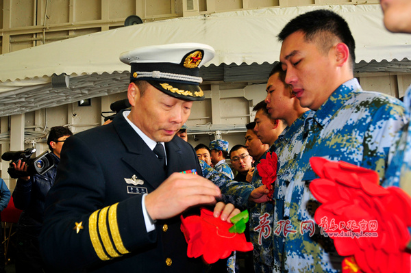 ????上午10點(diǎn),該船全體艦員整齊列隊(duì)。隨著船長(zhǎng)張鴿宣讀退伍命令,12名因執(zhí)行赴馬爾代夫緊急供水任務(wù)而推遲復(fù)員的今年退伍老兵,卸下軍銜,胸帶紅花,面向鮮艷的軍旗舉起右手,莊嚴(yán)敬出最后一個(gè)軍禮,迎來(lái)了華麗的軍旅謝幕。該支隊(duì)副支隊(duì)長(zhǎng)李保恒、政治部副主任李文杰代表支隊(duì)領(lǐng)導(dǎo)和機(jī)關(guān),來(lái)到現(xiàn)場(chǎng)為老兵送行。