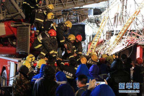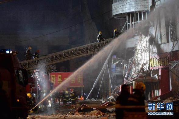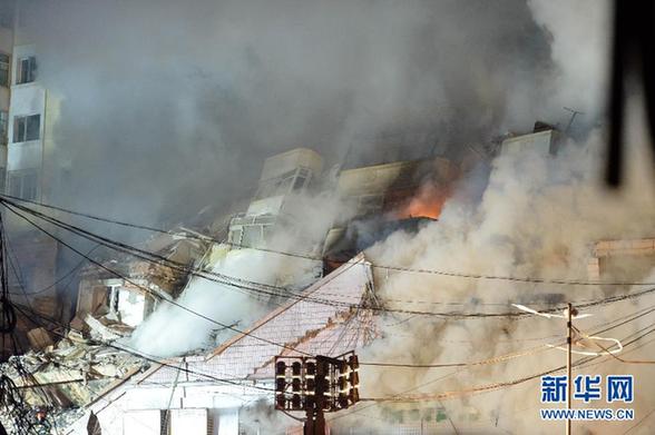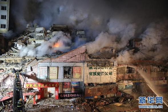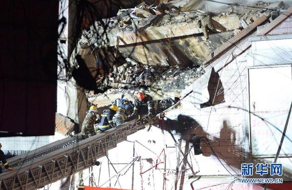 圖為因哈爾濱倉庫大火坍塌的居民樓(1月2日晚攝)?!⌒氯A社記者 王凱 攝
