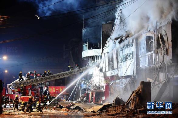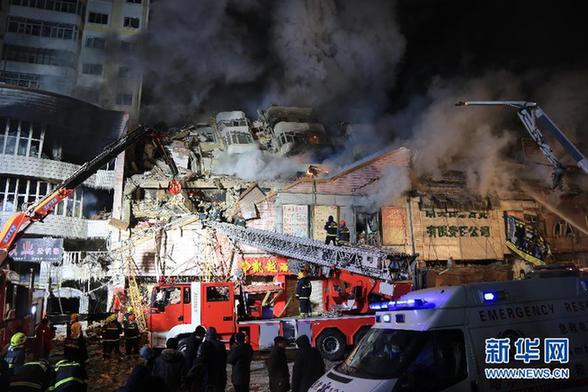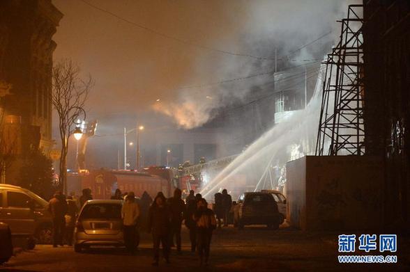 1月3日凌晨,消防戰(zhàn)士在哈爾濱大火現(xiàn)場救援?!⌒氯A社記者 王凱 攝