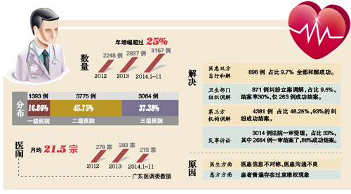 ????據(jù)不完全統(tǒng)計(jì),從2012年至2014年11月間,全省發(fā)生醫(yī)患糾紛呈現(xiàn)節(jié)節(jié)攀升勢頭——2012年,2248例;2013年,2837例;2014年1~11月,3167例。年增幅超過25%。