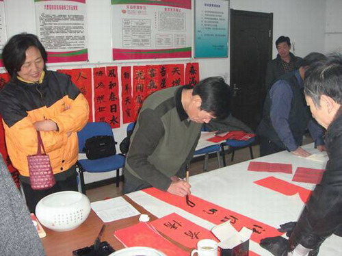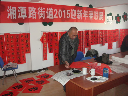 為加強民族傳統(tǒng)節(jié)日宣傳教育,弘揚中華民族優(yōu)秀傳統(tǒng)文化,營造喜慶熱烈、文明祥和、溫馨和諧的元旦春節(jié)氛圍,近日湘潭路街道舉辦2015迎新年春聯(lián)展,轄區(qū)30余名書法愛好者積極踴躍參加,并邀請部分書法愛好者現(xiàn)場寫對聯(lián)活動,共寫對聯(lián)和“福”近6百幅,這部分對聯(lián)和“?!睂①浰洼爡^(qū)老人及弱勢群體,以表達對他們關心。