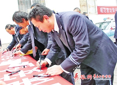 ■昨日(1月27日),市交通運輸系統(tǒng)“打非治違”專項行動啟動后,中青出租公司積極響應,駕駛員在簽字儀式上承諾,為乘客提供快捷、方便、安全、舒適的乘車服務。傅學軍 攝