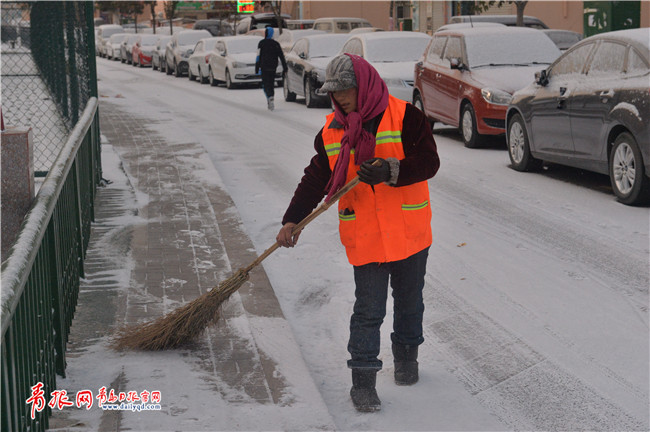 2015年的第一場雪 環(huán)衛(wèi)工人清晨掃雪忙