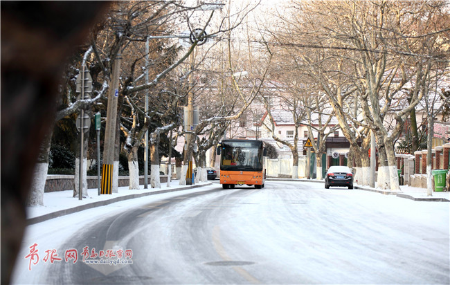 ??? 早起看到窗外一片白茫茫,又下雪啦。在青島體育街,環(huán)衛(wèi)工已經(jīng)在清掃積雪。清早4點鐘就上崗工作的環(huán)衛(wèi)工王榮英說,早晨5點鐘開始下雪,下了約有半個小時,到6點鐘又下了一次。今天是周日,馬路上沒有急匆匆的上班人流,不多的車輛行駛地小心翼翼。