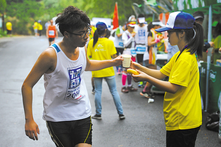 ?。玻埃保磳幉ǎń保┥降伛R拉松賽上,志愿者為選手熱忱服務(wù)。(李巖宏 攝)