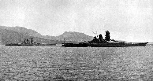 資料圖:1943年,停泊在丘克群島的大和(左)和武藏。
