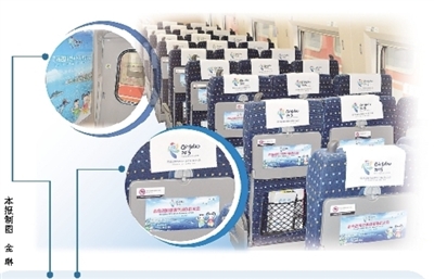 “世界休閑體育大會——青島號”專列,在車門、座位頭枕巾、小桌板、行李架下方車體、車廂兩端圖框和LED顯示屏、車內(nèi)廣播等部位,通過圖片、影像和語音等方式,全方位向乘客傳遞青島2015世界休閑體育大會的信息,使乘客從進入車廂開始就置身于青島2015世界休閑體育大會的濃厚氛圍之中。