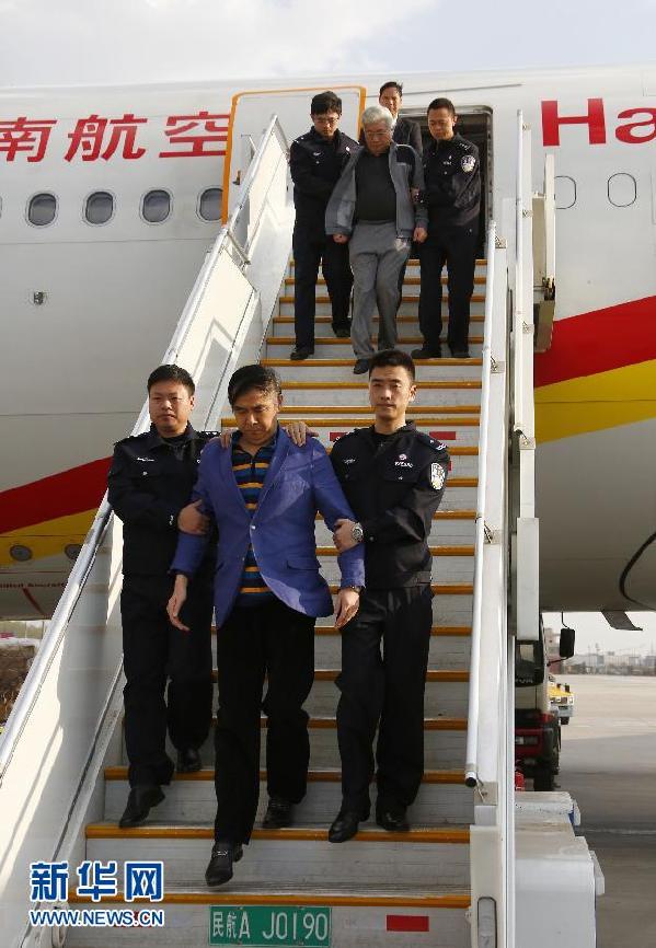 3月28日,天津市國(guó)稅局直屬分局原局長(zhǎng)龐順喜(前中)、天津港保稅區(qū)瀚通國(guó)際貿(mào)易有限公司原總經(jīng)理安慧民被押解回國(guó)。當(dāng)日下午,按照中央反腐敗協(xié)調(diào)小組國(guó)際追逃追贓工作辦公室的統(tǒng)一部署,在我外交部和駐老撾使館大力支持下,公安部派出的聯(lián)合緝捕工作組將潛逃老撾的天津市國(guó)稅局直屬分局原局長(zhǎng)龐順喜、天津港保稅區(qū)瀚通國(guó)際貿(mào)易有限公司原總經(jīng)理安慧民成功押解回國(guó),取得了反腐敗國(guó)際追逃追贓“天網(wǎng)”行動(dòng)的首個(gè)戰(zhàn)果。龐順喜、安慧民因分別涉嫌受賄罪、行賄罪于2014年12月被天津市河西區(qū)人民檢察院立案?jìng)刹?,案發(fā)后潛逃至老撾。公安機(jī)關(guān)與天津市相關(guān)辦案單位組成聯(lián)合緝捕工作組赴老撾,在老撾執(zhí)法機(jī)關(guān)積極配合下,經(jīng)過(guò)多日艱苦細(xì)致的摸排偵查和控制擠壓,二人于近日向我駐老撾使館投案。新華社記者殷剛 攝