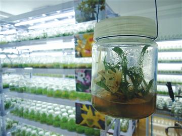 ????“這些都是靠細(xì)胞組織培養(yǎng)起來的,有的是雜交,有的是克隆。 ”潘曉波博士邊介紹邊捧起一小盆蘭花瓶苗。蘭花苗青綠可愛,綠綠的細(xì)長葉片下隱約能看見乳白色的小花瓣?!斑@些蘭花苗就像是我的孩子一樣,每天都要看它們的生長發(fā)育狀況,一有什么風(fēng)吹草動,惟恐傷害了它們。這里必須保持恒溫,并且是無菌培養(yǎng),實驗苗室除了我和助手以外,任何人也不能進(jìn)去,一旦帶進(jìn)病菌,后果不堪設(shè)想。 ”潘曉波說。