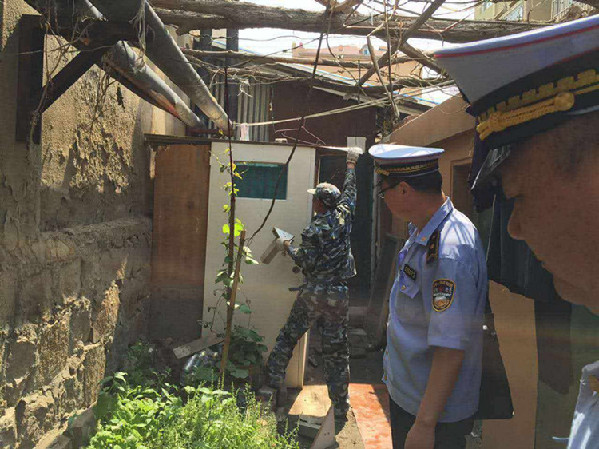 李村中隊(duì)進(jìn)社區(qū)拆除東山社區(qū)東山四路48號(hào)樓亂搭亂建