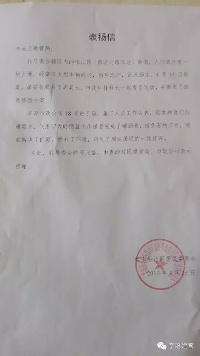 一封來自樓山路社區(qū)居民的表揚信