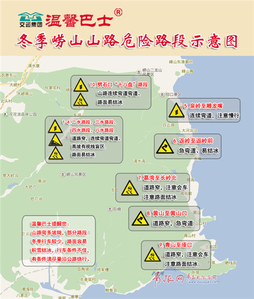 > 正文青島日報/青島觀/青報網(wǎng)訊 嶗山山路彎多坡陡,冬季路面容易積雪積冰。交運溫馨巴士的駕駛員結(jié)合多年山路駕駛經(jīng)驗,繪制了冬季嶗山山路危險路段示意圖,并向市民分享了冬季山路行駛的注意事項。