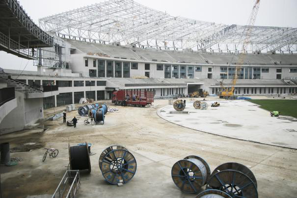 > 正文????一、奧體中心項(xiàng)目:體育館(球類館)的貴賓室、VIP房間、新聞發(fā)布廳等所有功能間及衛(wèi)生間、休息室、樓梯間、訓(xùn)練館等全部完成,具備拳擊預(yù)選賽及后期的比賽需要。體育燈光照明、擴(kuò)聲系統(tǒng)、LED顯示屏、計(jì)時(shí)計(jì)分系統(tǒng)及升旗系統(tǒng)等全部安裝調(diào)試完成,木地板安裝修邊完成,具備比賽條件,并移交組委會(huì)籌備委員會(huì)。外立面涉及到的幕墻、干掛、鋁板、門窗工程,全面結(jié)束。球類館涉及到的給排水、消防、通風(fēng)、強(qiáng)弱電等分項(xiàng)全部完成,具備比賽條件。空調(diào)系統(tǒng)全部正常運(yùn)行。5月15日完成空氣檢測(cè)出具檢測(cè)報(bào)告,所有指標(biāo)均符合標(biāo)準(zhǔn)要求。體育場(chǎng)窗、座椅預(yù)留預(yù)埋、西看臺(tái)鋼結(jié)構(gòu)安裝、東看臺(tái)桁架安裝已全部完成。正在進(jìn)行東看臺(tái)屋面系統(tǒng)、幕墻(完成86%)、窗精裝(完成總量49%)、弱電施工(完成90%),操場(chǎng)瀝青開(kāi)始鋪裝,各項(xiàng)體育工藝預(yù)留預(yù)埋全部完成,暖通、消防、水等專業(yè)施工(進(jìn)度均已達(dá)到95%)、大型設(shè)備進(jìn)場(chǎng)安裝,強(qiáng)電控制室安裝完成正在調(diào)試設(shè)備,市政熱力機(jī)房設(shè)備安裝全部結(jié)束,正在進(jìn)行調(diào)試(根據(jù)現(xiàn)場(chǎng)進(jìn)度合理優(yōu)化設(shè)備廠家進(jìn)場(chǎng)時(shí)間,全力保障工期)。