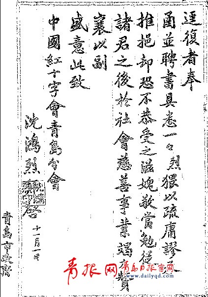 ????1932年10月,中國紅十字會青島分會給時任青島市長沈鴻烈發(fā)函,邀請他出任名譽會長。11月1日,沈鴻烈回復(fù)同意擔(dān)任名譽會長。之后,邀請市長擔(dān)任名譽會長成為民國時期中國紅十字會青島分會的慣例。