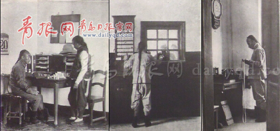 膠濟(jì)鐵路城陽(yáng)站站長(zhǎng)工作情景。 左:匯總收入 中:售票 右:收發(fā)電報(bào)