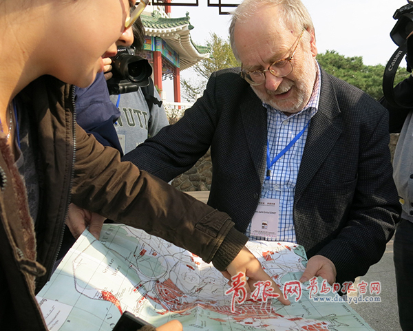 ????研究日德戰(zhàn)爭的德國歷史學家施密特先生向記者展示1917年的青島老地圖。