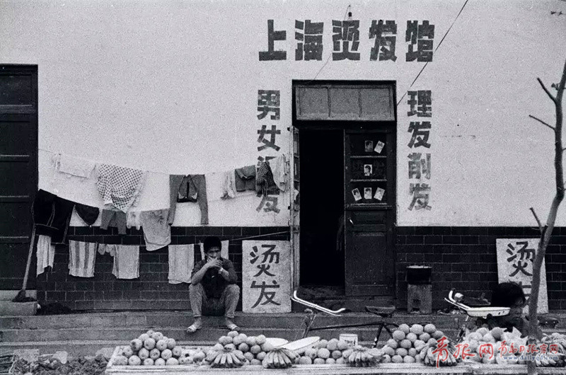 ????1982年,小商販在河北路一家上海燙發(fā)館門(mén)前擺攤賣(mài)水果。(青島日?qǐng)?bào)/青報(bào)網(wǎng)記者 王群 攝)?