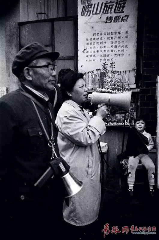 ????1984年太平路,兩位旅游公司的“小公共”車(chē)司乘人員在拉客去嶗山旅游。(青島日?qǐng)?bào)/青報(bào)網(wǎng)記者 王群 攝)