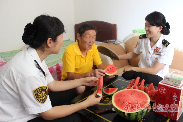 大爺,最近天熱,您盡量少活動,家里衛(wèi)生留著我們來打掃就行了,您吃點西瓜解解暑?!崩钚阋贿吔泻玫奈鞴线f給老人,一邊將帶來的一個袋子打開,里面裝滿了各種防暑降溫的東西,有綠豆、太陽帽、毛巾、藿香正氣水、便攜型小風(fēng)扇等。原來志愿者們得知老人已經(jīng)找到了一份工廠門衛(wèi)的工作,所以需要經(jīng)常外出,考慮到天氣痰熱便準(zhǔn)備了這樣一份消暑大禮包送給老人。