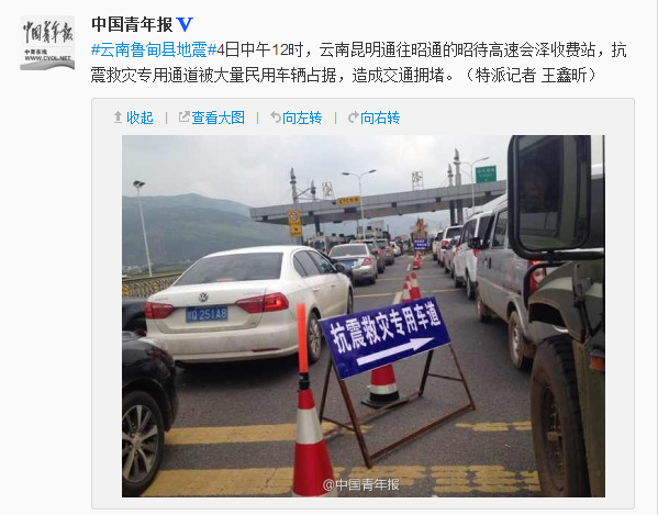 ?4日中午12時,云南昆明通往昭通的昭待高速會澤收費(fèi)站,抗震救災(zāi)專用通道被大量民用車輛占據(jù),造成交通擁堵。