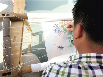 田世科指著手中的繡品說,一幅《傲菊爭艷》78厘米長47厘米寬,9朵花加上蟈蟈兒得繡四五個月才能完成,一天就能繡完幾片葉子。刺繡過程中,田世科需要用到60多種顏色的繡線,而且這些線都不長,隔一小會兒就得換線。這么費時費力的繡品當然不便宜,每幅能買到上萬元?!艾F(xiàn)在的魯繡基本不做實用品,基本都變成藝術(shù)品了?!碧锸揽普f。